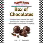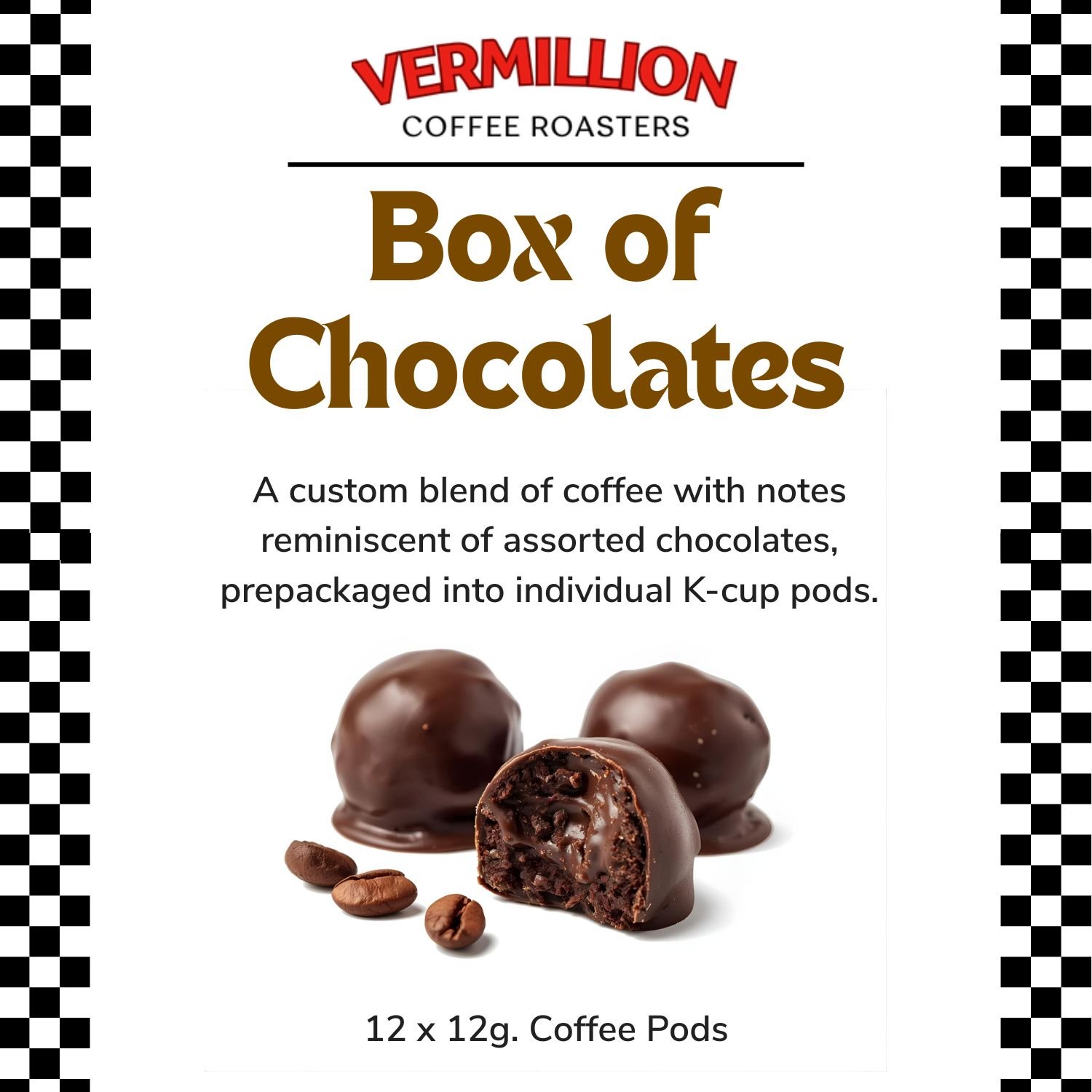 Coming soon for holiday 2025... This will is a box of twelve coffee pods for use with K-cup machines that will consist of 4 different coffee origins per pod known to produce chocolatey notes. This box utilizes specialty pods to hold more grounds than a standard retail cup in order to bring out a fuller flavor profile.